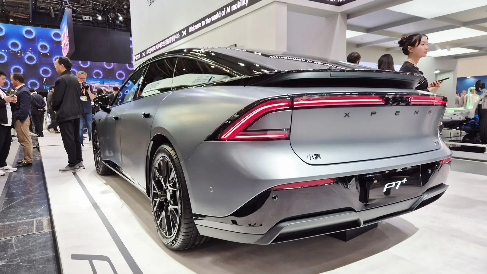 Сзади появились фонари с «кольцевой» графикой и интегрированной по центру литерой бренда, плюс добавлен синий огонь для ассистентов движения. Обновили и бампер — теперь он окрашен в цвет кузова; фирменный «утиный хвост» на стекле сохранили. На правой части кормы заметен шильдик «P7+ power ultra», подчеркивающий позиционирование версии.