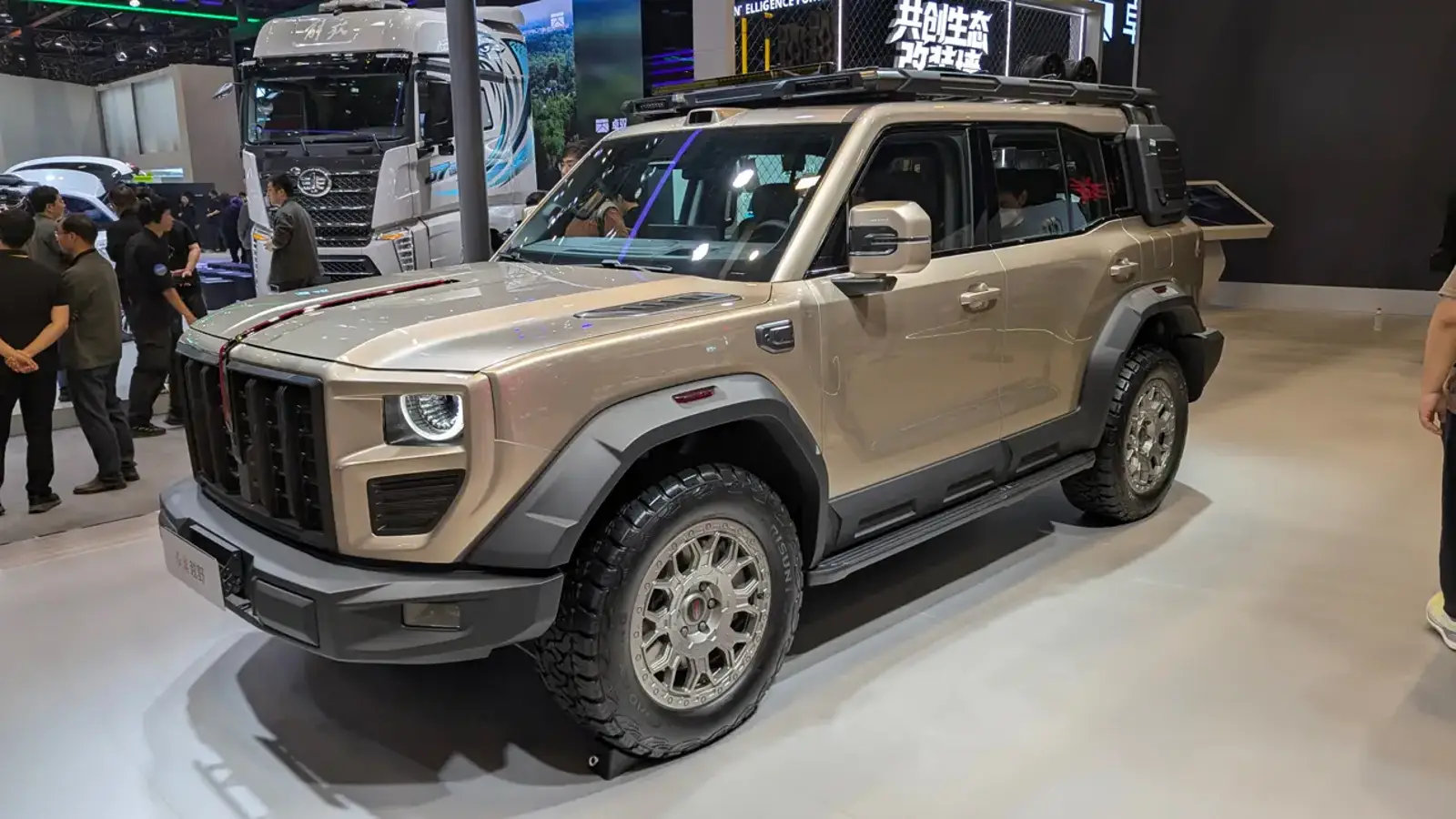 Внешность автомобиля выдержана в брутальном стиле: прямые линии, вертикальная решётка радиатора, массивные арки колёс с пластиковой защитой и запасное колесо на задней двери. Длина кузова превышает 5,1 м, колёсная база — около 2,9 м, что ставит модель в один ряд с такими крупными внедорожниками, как Haval H9. На крыше установлен LiDAR-датчик, указывающий на развитые системы помощи водителю.