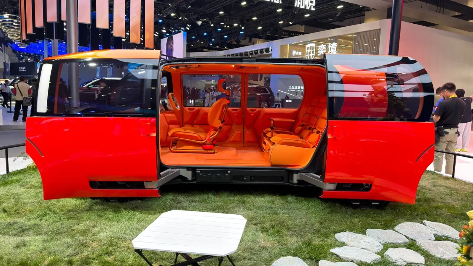 В салоне реализована нестандартная компоновка: место водителя расположено по центру, позволяя менять конфигурацию сидений от 1+3 до 3+3. Переднее кресло поворачивается, а при добавлении столика образуется рабочая зона. При сложении задних сидений и установке матраса получается спальное место. В крыше предусмотрена сдвижная секция с проекционным экраном, а второй ряд складывается и может использоваться как отдельные стулья на улице.