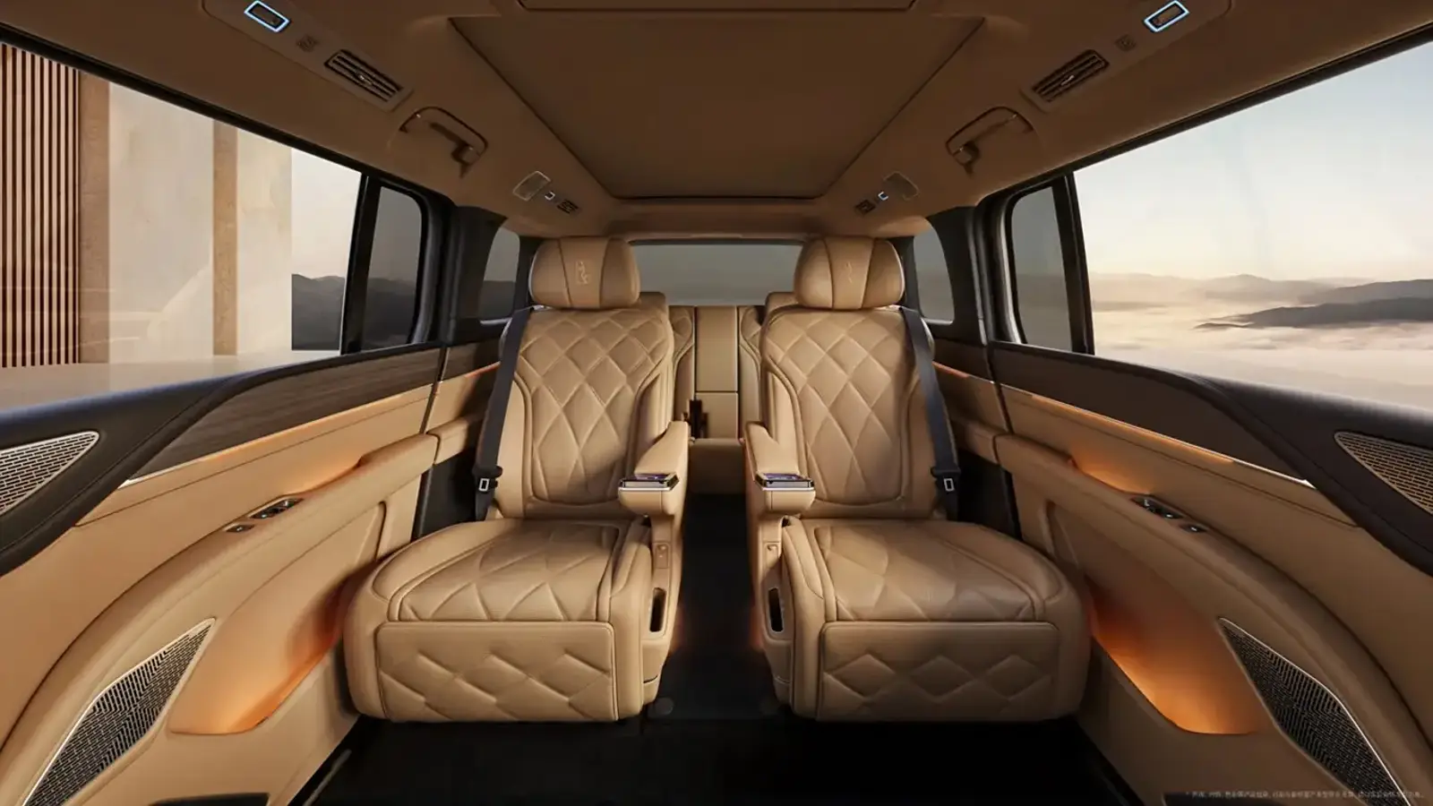 Салон — трёхрядный, в центре два раздельных VIP-кресла с индивидуальными экранами управления. Колёсная база — 3250 мм, общая длина — 5400 мм. От стандартного U8 модель отличается золотым логотипом из настоящего 24K золота, пишет 32CARS.RU.